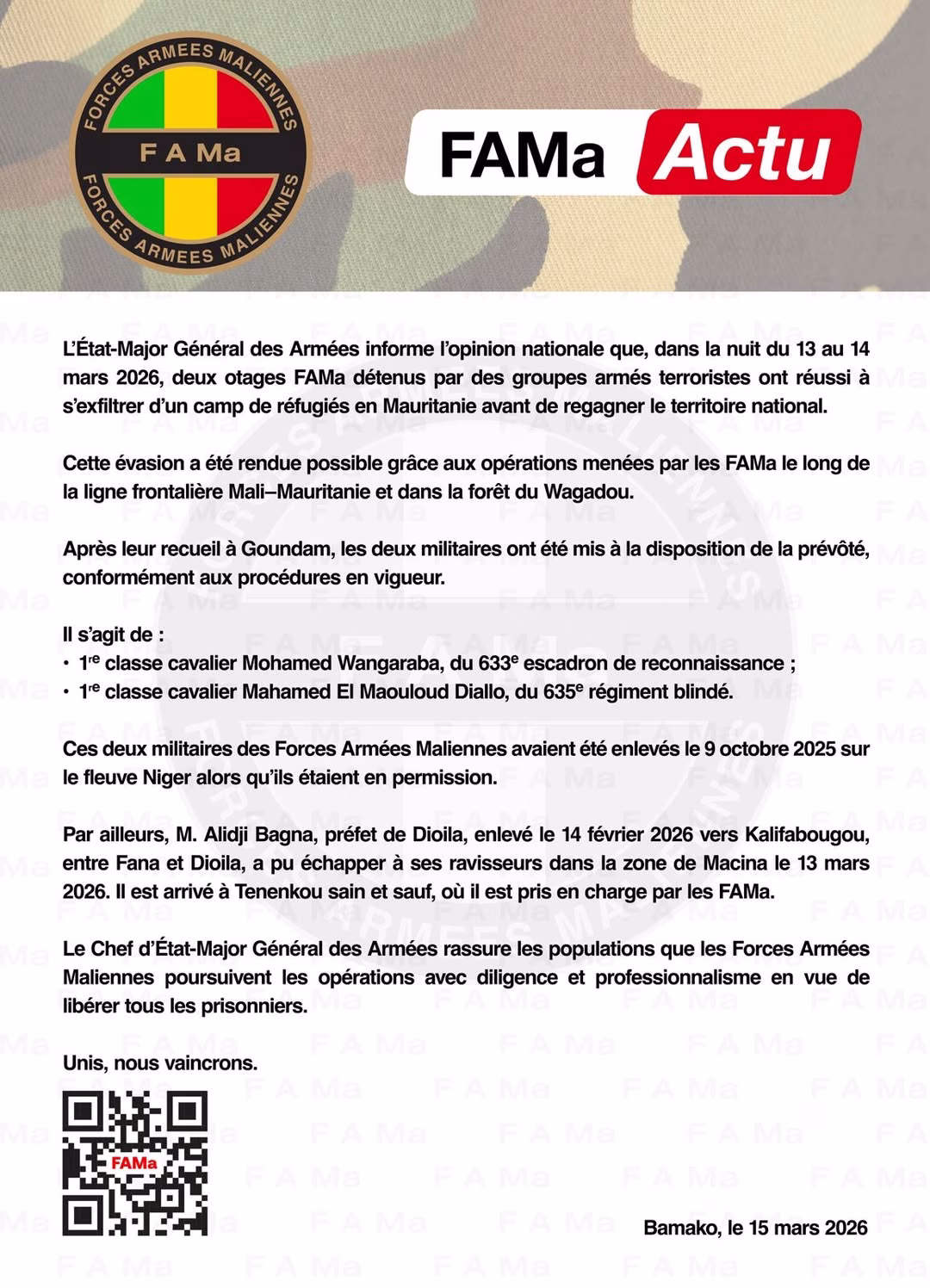 ببان الأركان العامة فى مالي ، أكد أن الأمر يتعلق بالعسكريين محمد وانغارابا، من سرب الاستطلاع 633، ومحمد المولود ديالو، من الفوج المدرع 635، مشيرة إلى أنهما كانا قد اختُطفا في أكتوبر 2025 أثناء وجودهما في إجازة قرب نهر النيجر.