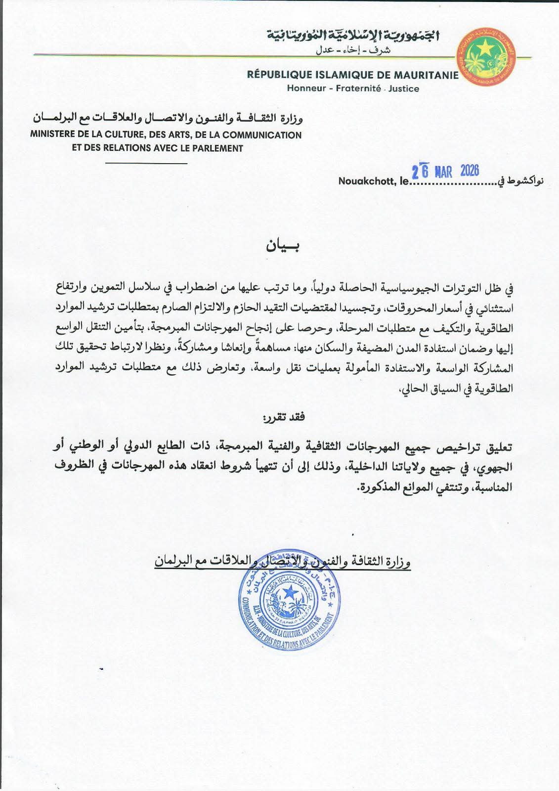 زوم – أعلنت وزارة الثقافة في نواكشوط تعليق جميع تراخيص المهرجانات الثقافية والفنية المبرمجة، في إطار إجراءات حكومية تهدف إلى ترشيد استهلاك الطاقة والتكيّف مع التطورات الدولية الراهنة.